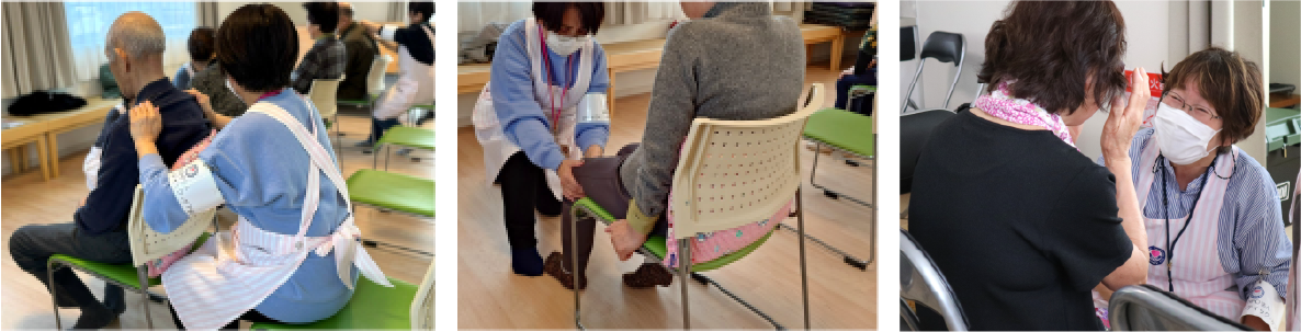 武雄市民と民間ボランティア団体が協力して立ち上げた民間のボランティアセンター「おもやいボランティア」と連携し、水害被災者の高齢者が通うデイサービスにて、第1回は35名、第2回は20名の利用者さまにケアを提供した。